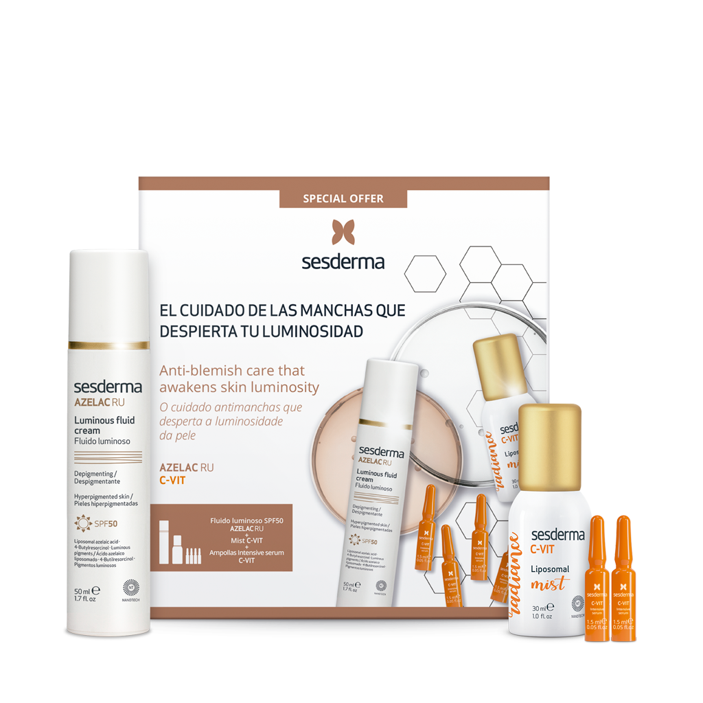 El cuidado de las manchas que despierta tu luminosidad. El pack contiene Azelac Ru Fluido Luminoso, C-VIT Mist Liposomal y C-VIT Ampollas Intensivas.